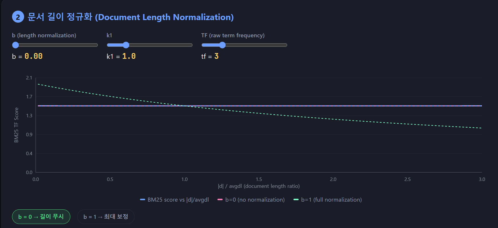 b 가 0 일때는 |d|/avgdl 에 대한 패널티가 없는 상태입니다. 따라서 x 축의 값인 |d| / avgdl 이 올라가도 그래프가 변하지 않습니다.