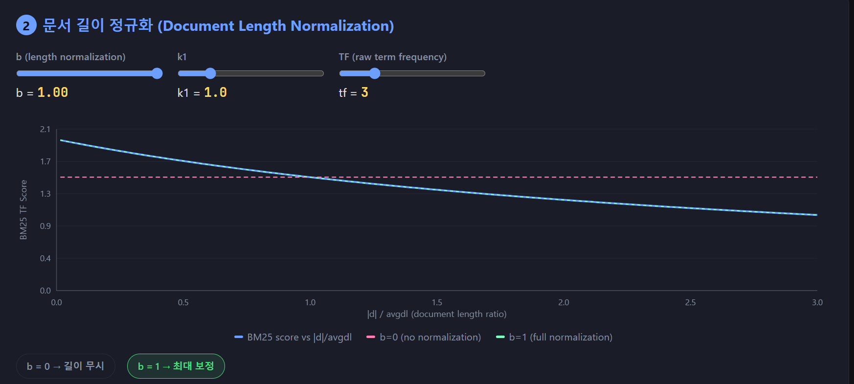 b 가 1 일때는 |d| / avgdl 이 커지면 커질수록 우하향 하는 모습을 확인할 수 있습니다. 즉, 분모의 값이 커지므로 점수가 빠르게 내려가는 것을 확인할 수 있습니다.