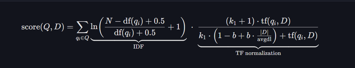 BM25 의 수식은 위와 같다. 엄청 복잡해 보이지만 복잡하게 적은 것일 뿐 하나하나 뜯어보면 그렇게 어렵지는 않다.