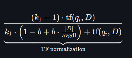 b 또한 가중치인데요. 여기서는 (1 - b + b * |d|/avgdl) 에만 집중하면 조금 더 쉽게 이해할 수 있습니다. 일단 |D| * avgdl 을 먼져 해석해보면 이 문서가 평균적으로 얼마나 긴가? 를 나타내는 값으로 볼 수 있습니다. 이 값이 분모에 있으므로 문서가 길면 길수록 점수가 낮아지는 구조가 됩니다. 즉, 문서가 길면 어떤 단어가 나올 확률도 높다고 생각해서 정규화를 해준다고 생각하면 됩니다.
